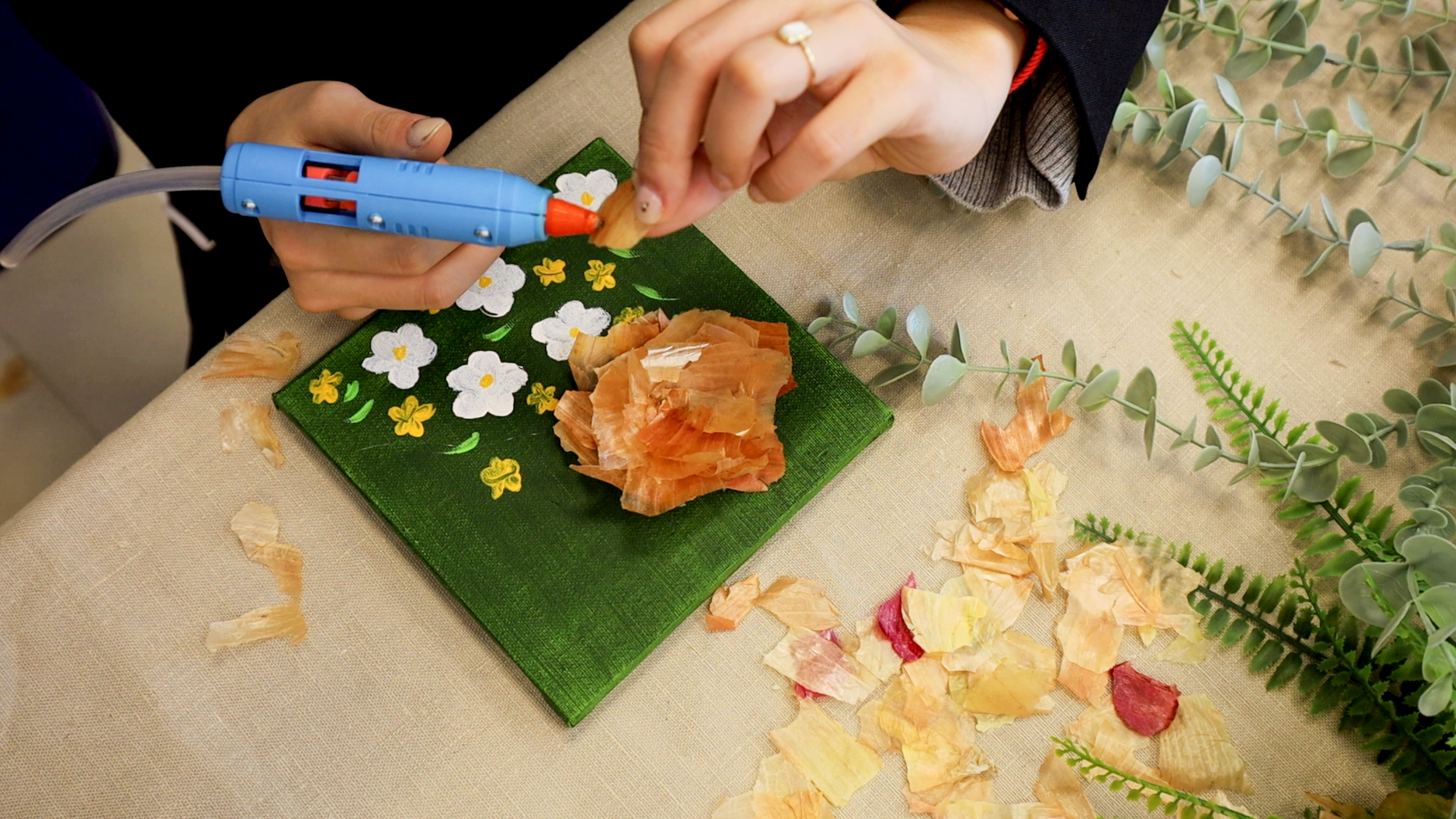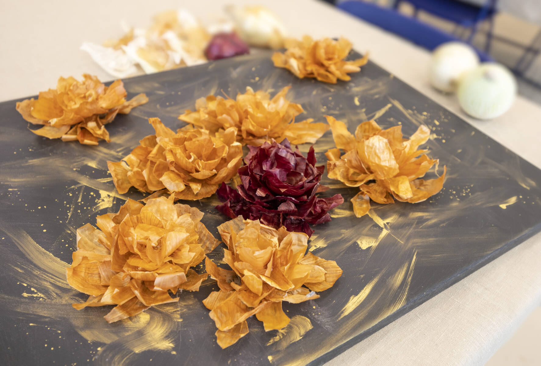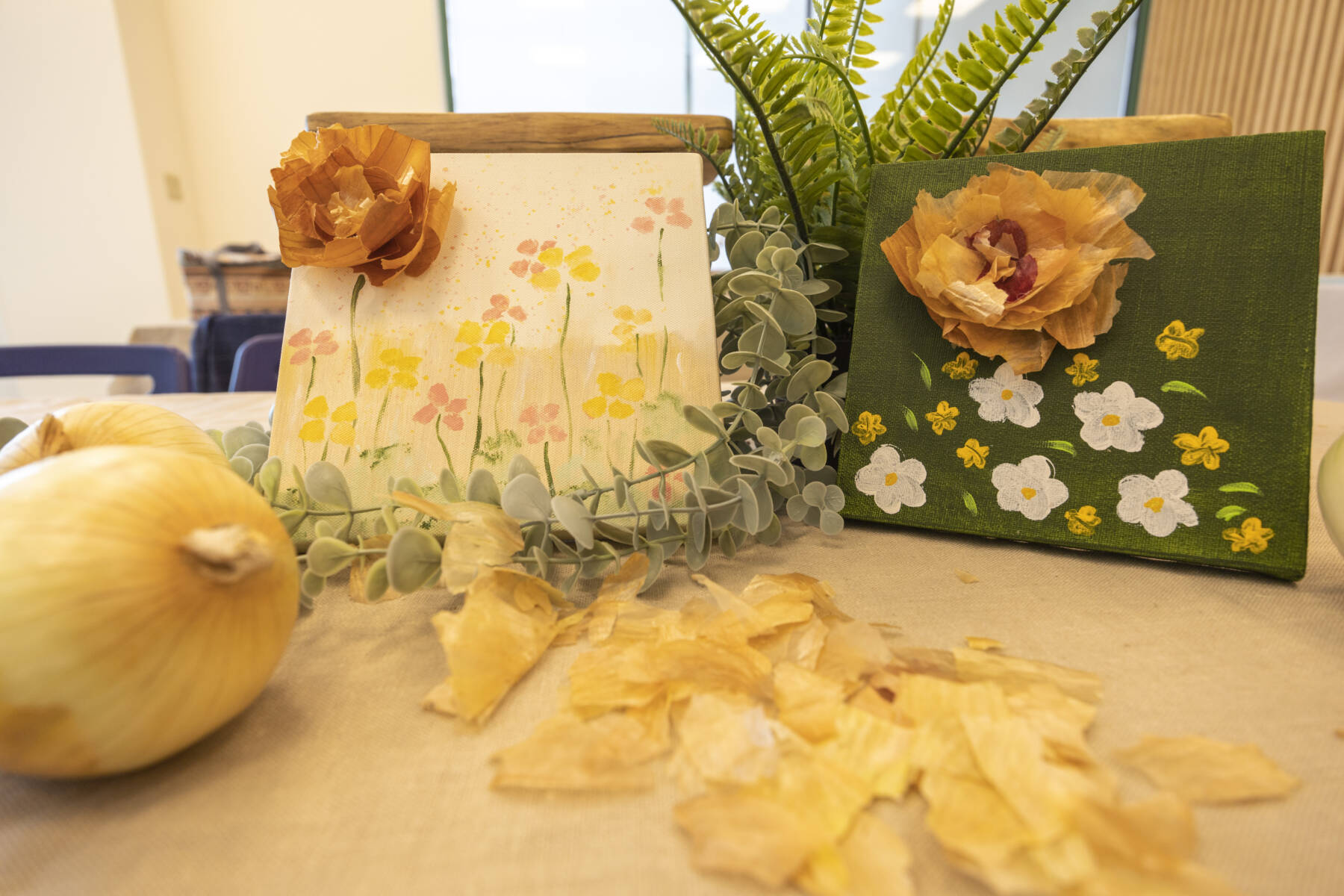 ▲使用在地車城洋蔥製作而成的洋蔥染布,百變的花紋等您來創造~