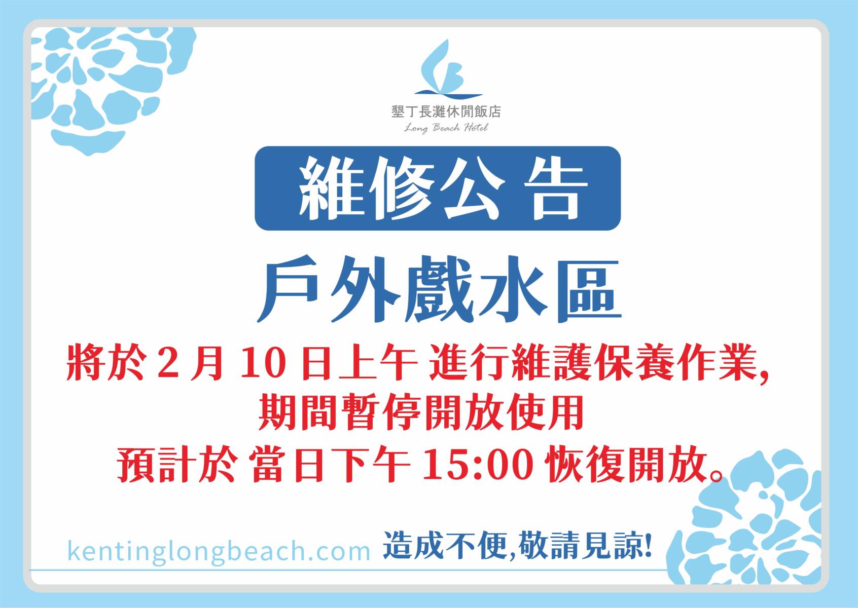 戶外戲水池將於2月10日進行維護保養作業,暫停開放