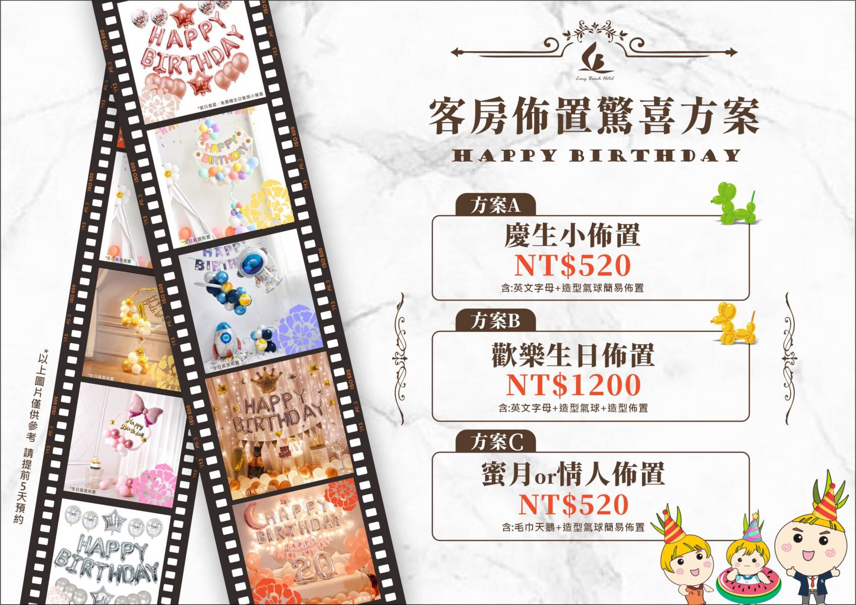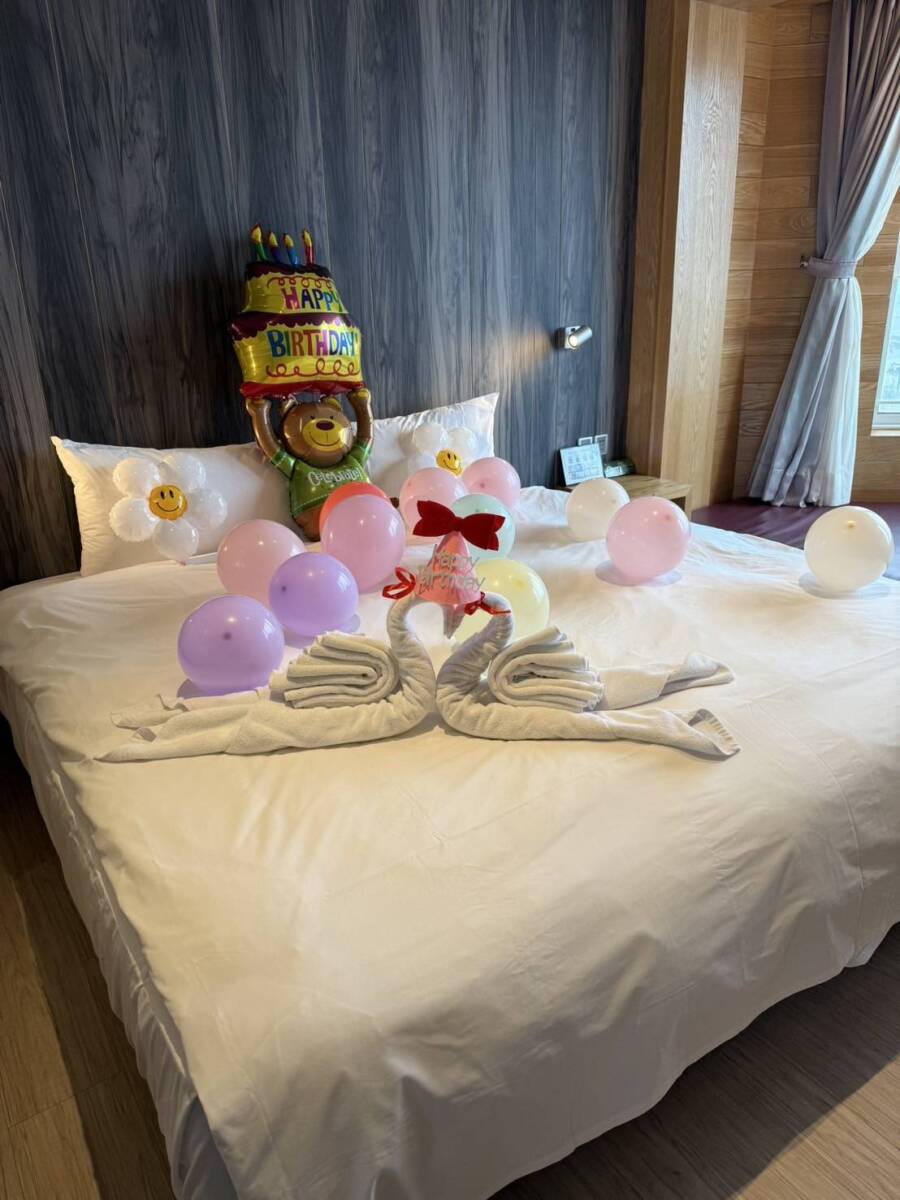 以下分享我們之前位貴賓佈置的客房照片喔~僅供參考,依房型、造型風格會有所變動。 ↓ ↓ ↓ 歡樂生日佈置(英文字母+造型氣球+造型佈置)$1200