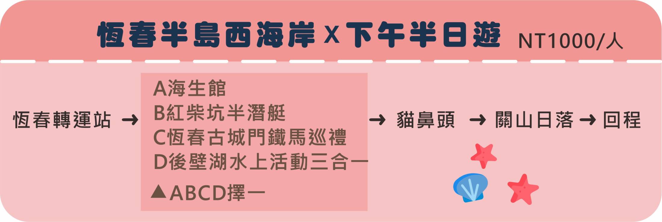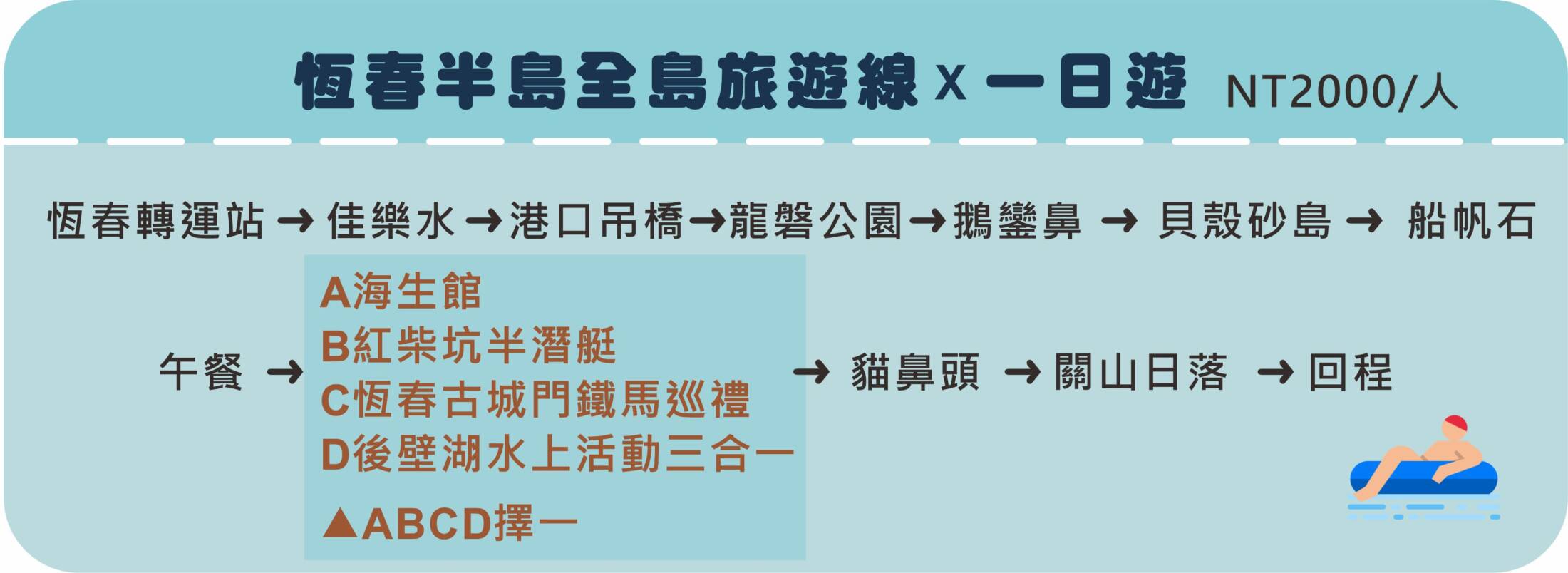 A海生館、B半潛艇+白沙、C恆春古城鐵馬巡禮、D後壁湖水上活動三合一