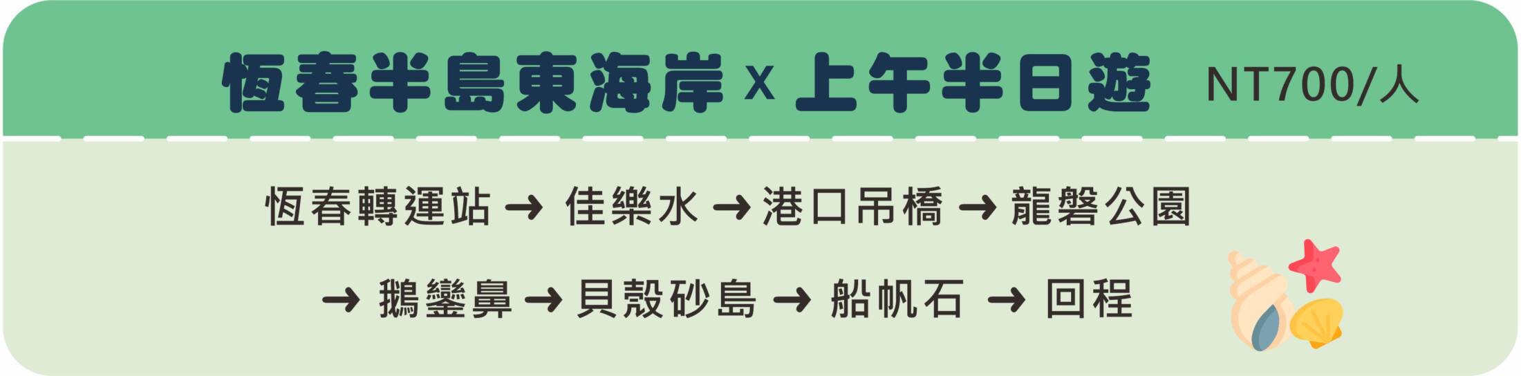 註2:台灣觀巴墾丁旅遊線-東海岸的佳樂水、港口吊橋,目前暫以風吹沙與台灣最南點作替換,實際旅遊行程依台灣觀巴官網公告為主。