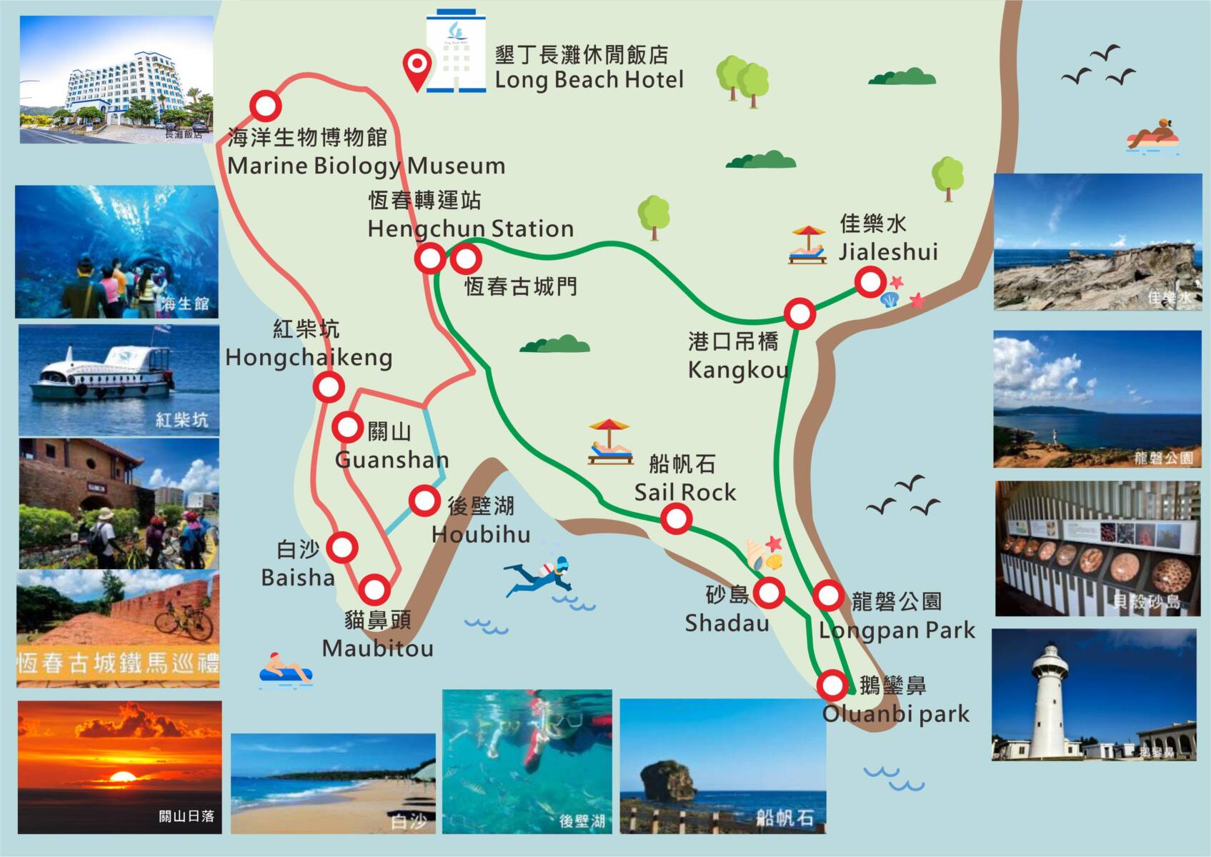 相關旅遊預定行程資訊請洽墾丁長灘飯店-休閒部 (08-882-2666#6501)註1:請旅客自行前往恆春轉運站搭乘或預約墾丁長灘飯店接駁至恆春轉運站(費用為350元/單趟;飯店接駁預約專線:08-882-2666#6001) 註2:台灣觀巴墾丁旅遊線-東海岸的佳樂水、港口吊橋,目前暫以風吹沙與台灣最南點作替換,實際旅遊行程依台灣觀巴官網公告為主。 |